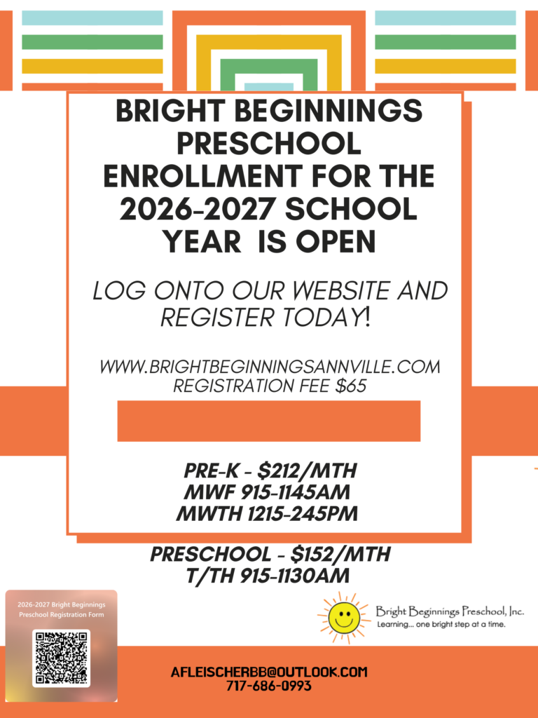 - Click the link to register your child for the 2026-2027 school year. Registration is first come first serve. Please see below for updates on class availability. 2026-2027 Bright Beginnings Preschool Registration Form – Fill out form
